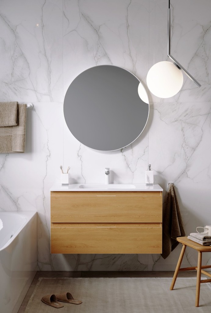 Подвесная тумба с двумя ящиками в цвете дуб золотой с умывальником из литьевого мрамора