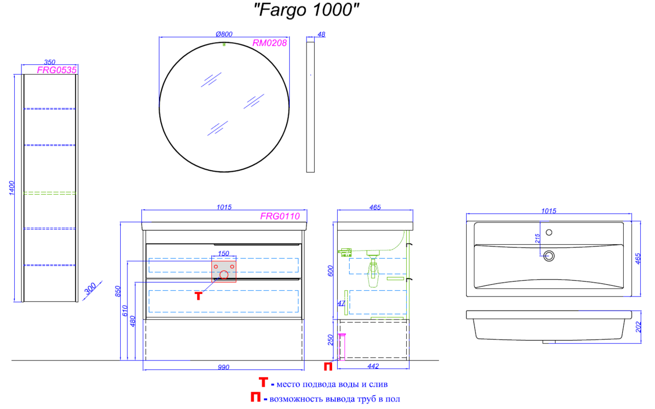 Подвесная тумба с умывальником Фостер 1000, два ящика.