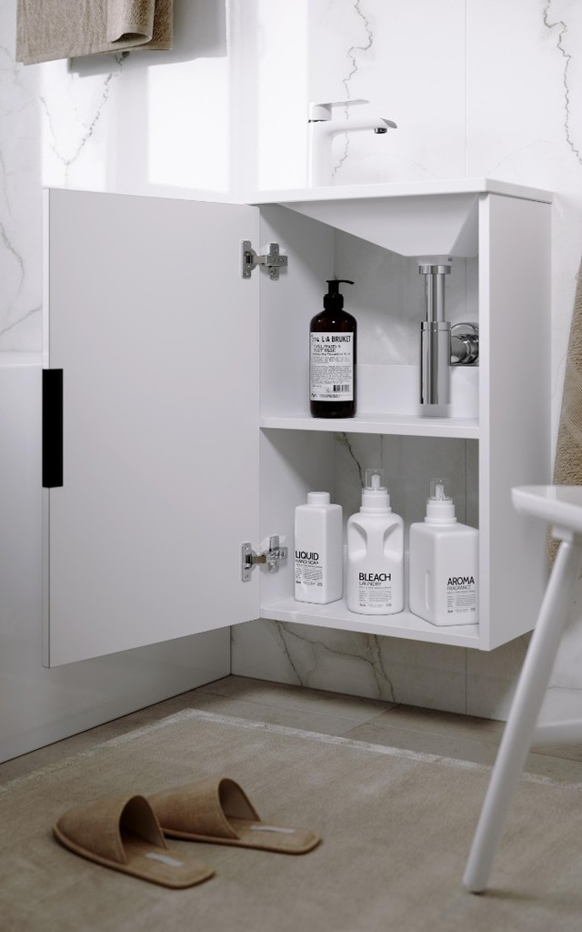 Подвесная тумба с одной универсальной левой/правой дверью в белом цвете с умывальником из литьевого мрамора.