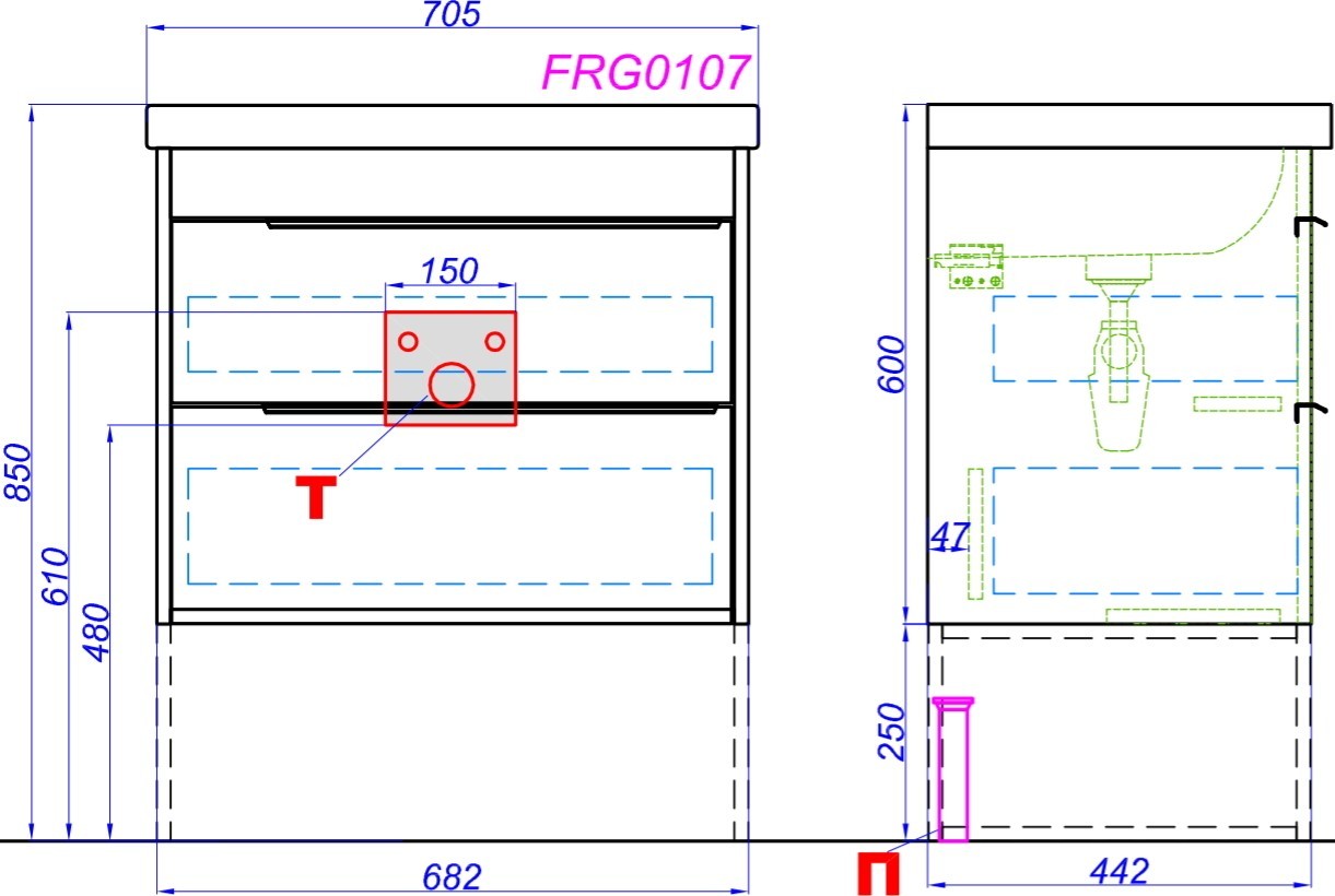 Подвесная тумба с умывальником Фостер 700, два ящика.