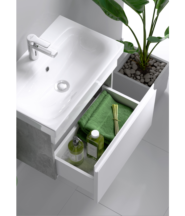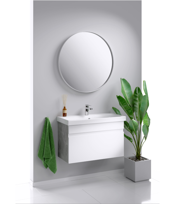 Подвесная тумба с одним ящиком, цвет бетон светлый с умывальником.
