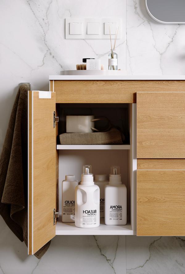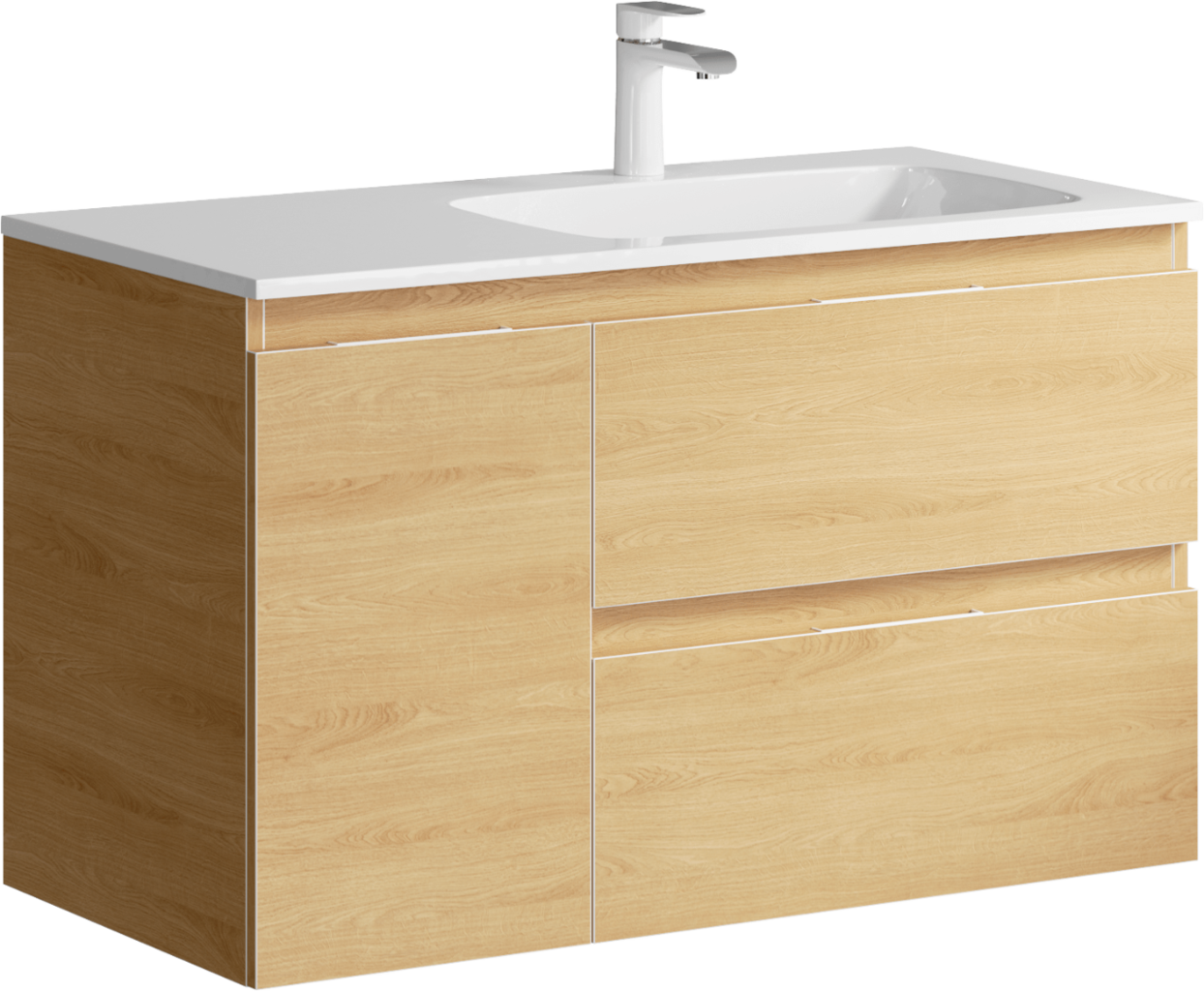 Подвесная тумба с двумя ящиками и одной дверью в цвете дуб золотой с умывальником из литьевого мрамора (чаша справа)