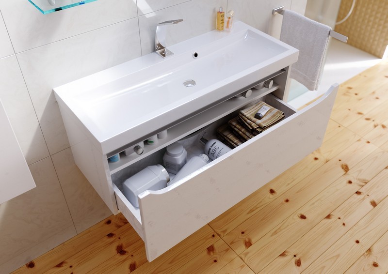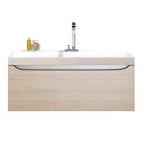 Подвесная тумба в цвете акация с одним выдвижным ящиком и полкой, скрытой за фасадом, с умывальником из литьевого мрамора