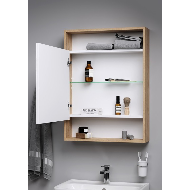 Универсальный левый/правый зеркальный шкаф с одной дверью и двумя открытыми полками, цвет дуб балтийский.