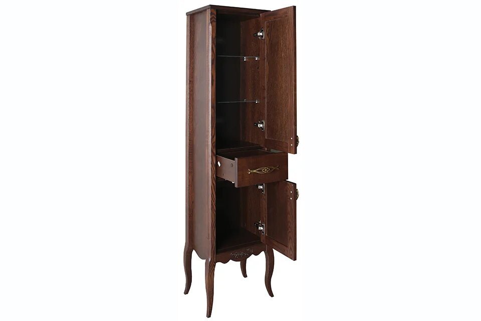 Напольная колонка с распашными дверцами и выдвижным ящиком. Внутренне пространство верхнего отделения оснащено двумя полками. Пенал выполнен из массива ясеня, дверцы и ящик с доводчиками.