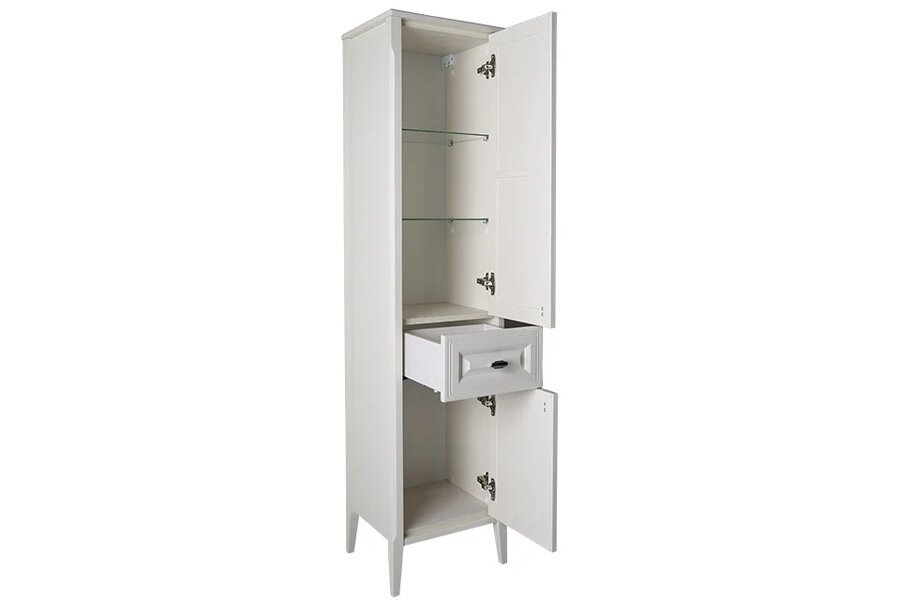Напольная колонка с распашными дверцами и выдвижным ящиком. Внутренне пространство верхнего отделения оснащено двумя полками. Пенал выполнен из массива ясеня, дверцы и ящик с доводчиками.
