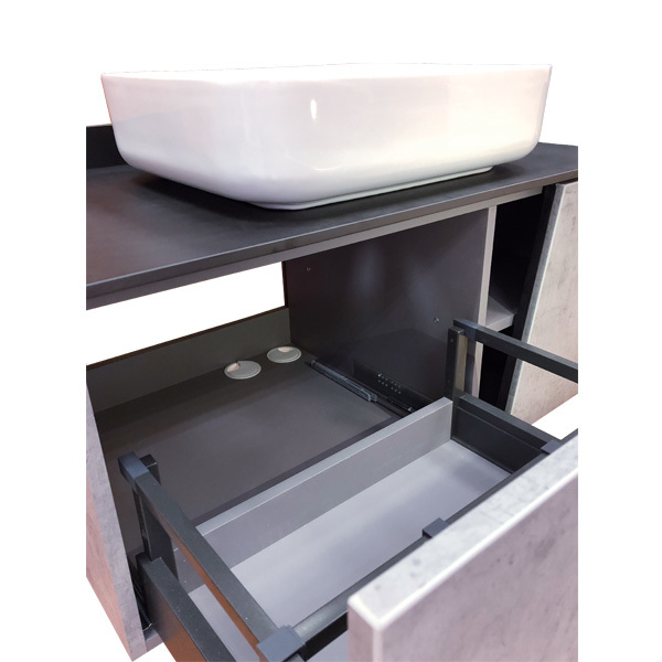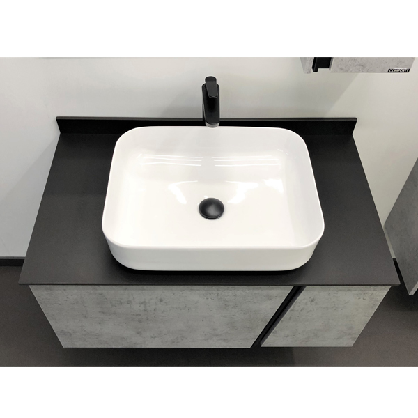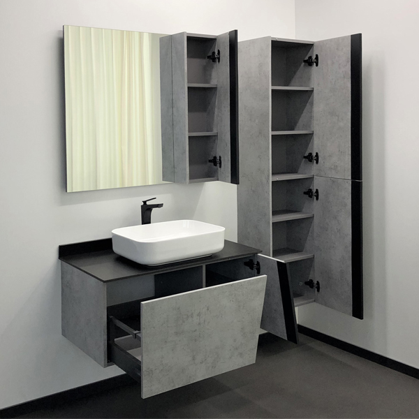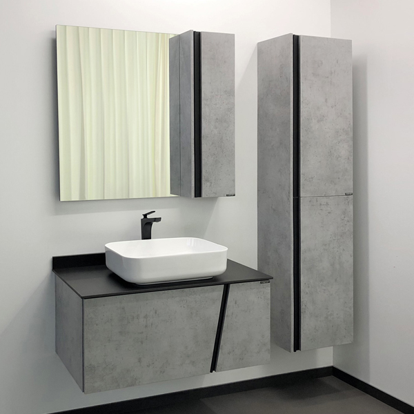 Тумба-умывальник Эдинбург 90 Варианты цвета корпуса и фасада: Бетон светлый Материал корпуса: влагостойкое ЛДСП Габариты (ШхВхГ): 900*540*520 мм Комплектация: накладная раковина Comforty T-Y9378, столешница и плинтус из черного керамогранита. Тумба оборудована большим выкатным ящиком и дополнительной боковой нишей. Пространство внутри ящика разделено специальным органайзером. За боковой створкой одна горизонтальная полка. Фасад ящика оборудован системой Push-to-Open (открытие при нажатии), у боковой створки петля с механизмами плавного закрывания.
