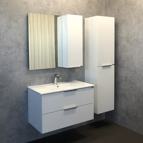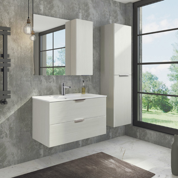 Подвесная шкаф-колонна с двумя распашными дверками. Фасады и корпус тумбы из влагостойкого ДСП с имитацией текстуры натурального дерева - сосна белая.