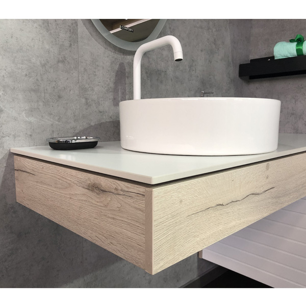 Подвесная консоль Клеон 120 Варианты цвета корпуса: дуб дымчатый Материал корпуса: влагостойкое ЛДСП Цвет столешницы: белый матовый Материал столешницы: керамогранит Габариты (ШхВхГ): 1200*250*500 мм Комплектация: круглая керамическая раковина Comforty 9110 диаметром 400 мм без перелива