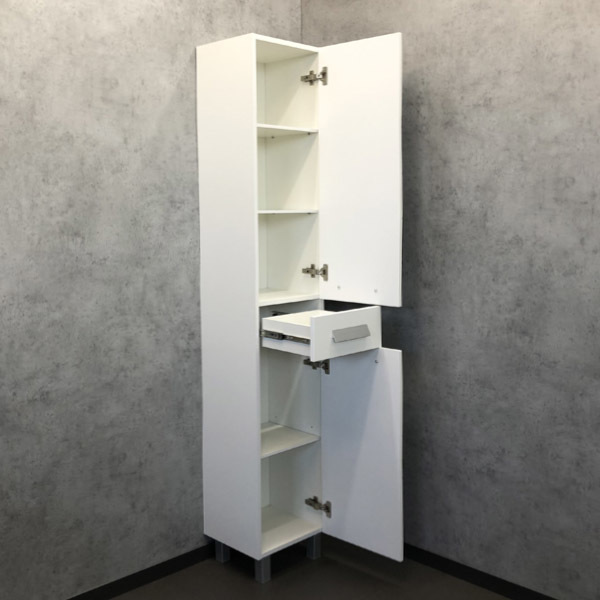 Шкаф-колонна Модена М35 (правая) Варианты цвета корпуса: Белый матовый Материал: влагостойкое ЛДСП Вариант цвета фасада: Белый матовый Материал фасада: МДФ Габариты (ШхВхГ): 350*1902*316 мм Шкаф-колонна отличное решение для хранения разных предметов необходимых в ванной комнате. За нижней дверцей одна горизонтальная полка, за верхней - две. Ящик с направляющими полного выдвижения.