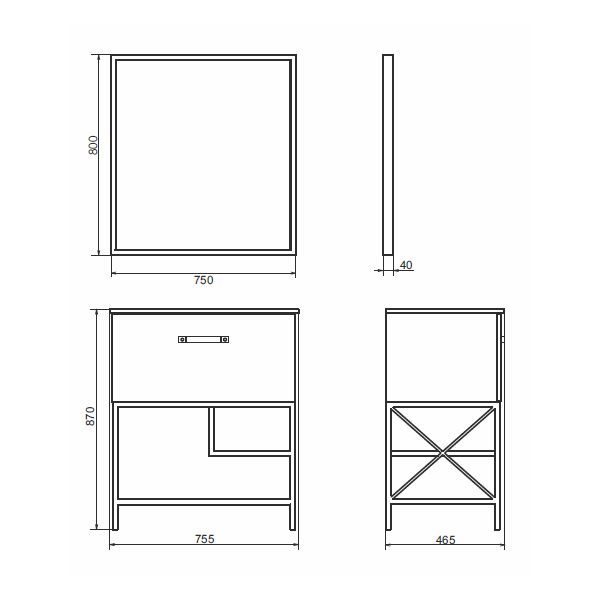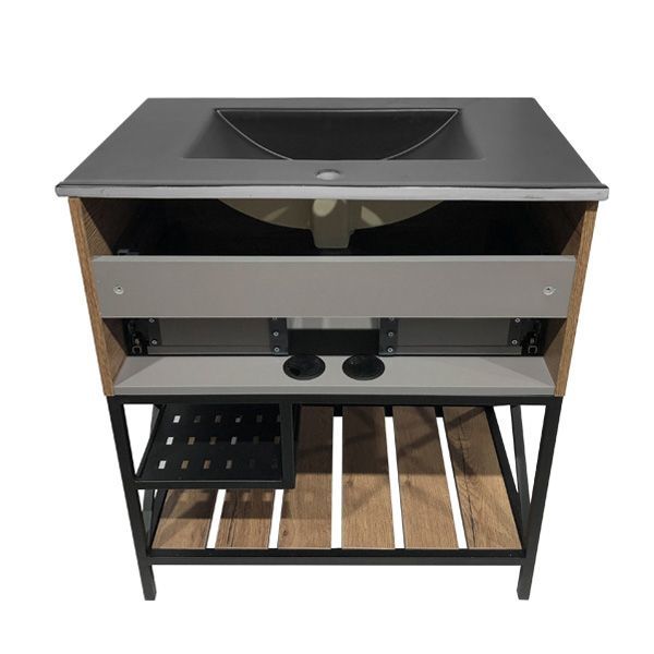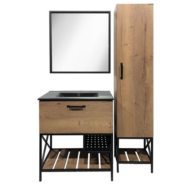 Тумба-умывальник Бредфорд 75 Варианты цвета корпуса и фасада: Дуб темный Материал корпуса: влагостойкое ЛДСП Варианты цвета каркаса: черный Материал каркаса: сталь Габариты (ШхВхГ): 755*870*465 мм Комплектация: накладная черная матовая раковина Comforty 75E Напольная тумба-умывальник с одним широким выкатным ящиком, оснащенным системой плавного закрывания и пространствами открытого хранения. В основании тумбы - каркас из стального профиля окрашенный черной эмалью. Тумба подготовлена для подключения коммуникаций снизу.