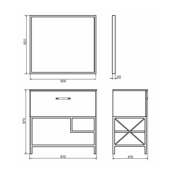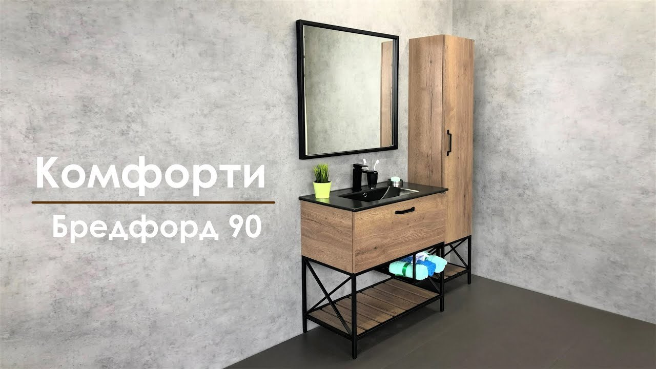 Тумба-умывальник Бредфорд 90 Варианты цвета корпуса и фасада: Дуб темный Материал корпуса: влагостойкое ЛДСП Варианты цвета каркаса: черный Материал каркаса: сталь Габариты (ШхВхГ): 910*870*470 мм Комплектация: накладная черная матовая раковина Comforty 90E Напольная тумба-умывальник с одним широким выкатным ящиком, оснащенным системой плавного закрывания и пространствами открытого хранения. В основании тумбы - каркас из стального профиля окрашенный черной эмалью. Тумба подготовлена для подключения коммуникаций снизу.