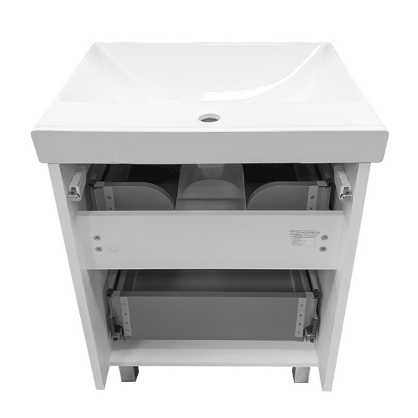 Тумба-умывальник Дублин 60 Варианты цвета корпуса: Белый глянец Материал корпуса: влагостойкое ЛДСП Цвет фасада ящиков: Белый глянец Материал фасада: Материфл фасада:МДФ Габариты (ШхВхГ): 605*850*460 мм Комплектация: раковина Comforty 8056 Напольная тумба с двумя выдвижными ящиками оснащенными системой плавного закрывания. Фасады покрыты белой глянцевой эмалью.