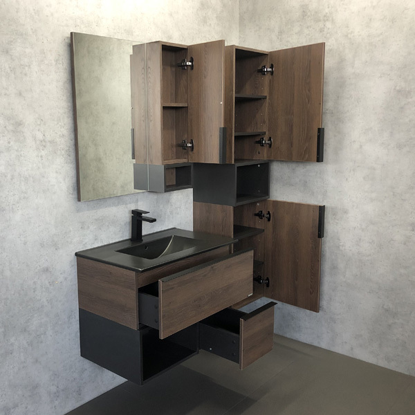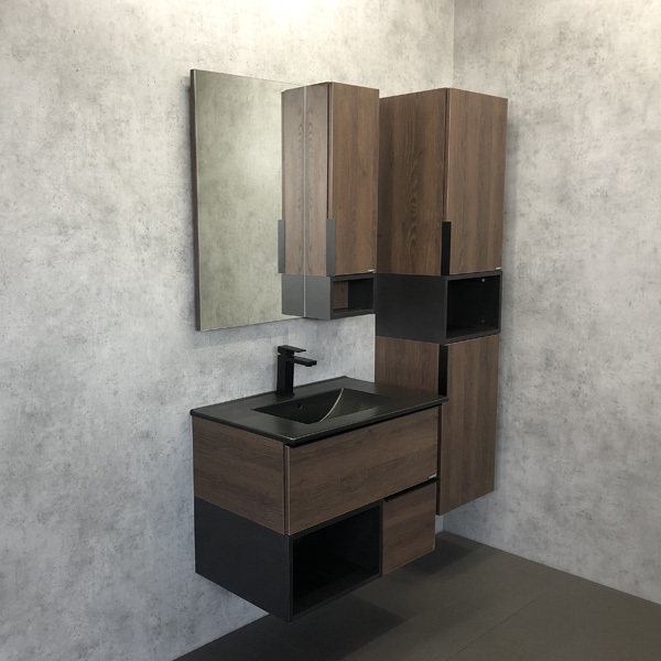 Тумба-умывальник Франкфурт 75 Варианты цвета корпуса: Дуб шоколадно-коричневый Материал корпуса: влагостойкое ЛДСП Цвет фасада: Дуб шоколадно-коричневый Материал фасада: влагостойкое ЛДСП Габариты (ШхВхГ): 750*560*465 мм Комплектация: накладная раковина Comforty 75E черная матовая. Подвесная тумба с двумя ящиками оборудованными системой плавного закрывания и пространством для открытого хранения. На ящиках тумбы черные матовые алюминиевые ручки.