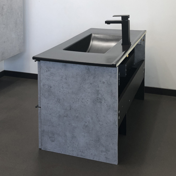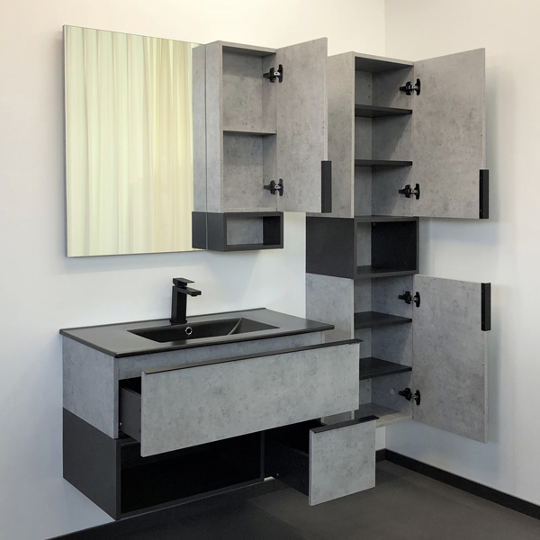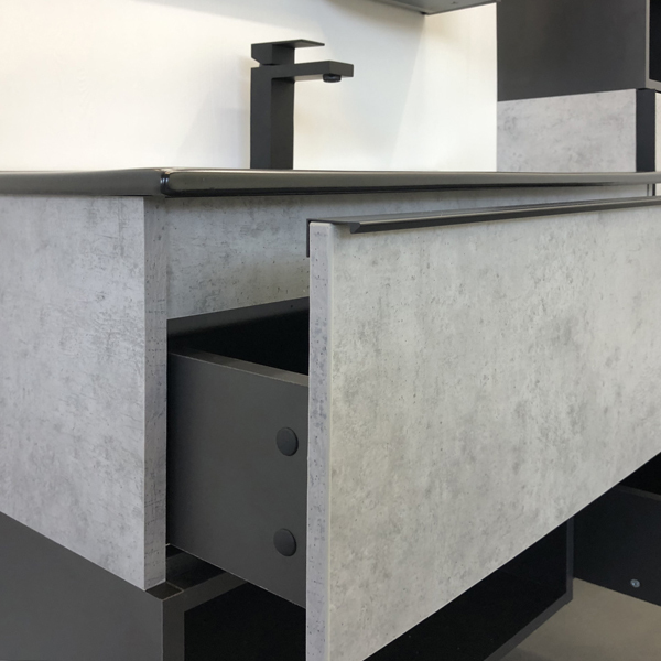 Тумба-умывальник Франкфурт 90 Варианты цвета корпуса: Бетон светлый Материал корпуса: влагостойкое ЛДСП Цвет фасада: Бетон светлый Материал фасада: влагостойкое ЛДСП Габариты (ШхВхГ): 910*560*465 мм Комплектация: черная раковина Comforty 90E Подвесная тумба с двумя ящиками оборудованными системой плавного закрывания и пространством для открытого хранения. На ящиках тумбы черные матовые алюминиевые ручки.