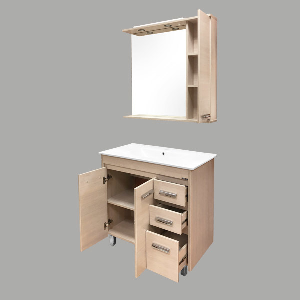 Тумба-умывальник Марио 90 Варианты цвета: Сосна Лоредо Материал корпуса и фасада: влагостойкое ЛДСП Габариты (ШхВхГ): 900*855*465 мм Комплектация: раковина "Quadro 90" Широкая напольная тумба-умывальник с двумя распашными створками оснащенной системой плавного закрывания и тремя ящиками.