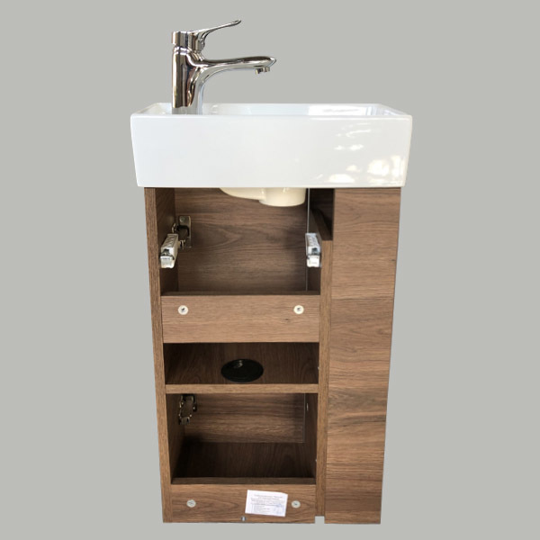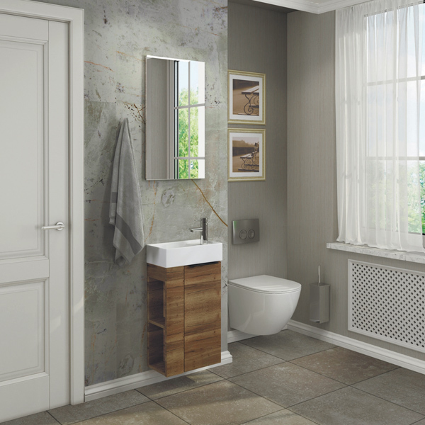 Тумба-умывальник Матэ 40 Варианты цвета корпуса и фасада: дуб темно-коричневый Материал корпуса: влагостойкая ЛДСП Габариты (ШхВхГ): 400*700*220 мм Комплектация: накладная раковина Cersanit Crea 40 Компактная подвесная тумба с распашной дверцей. Петли оснащены системой плавного закрывания. За дверцей одна горизонтальная полка. Корпус и фасад с тактильным эффектом натуральной древесины. В комплекте асимметричная раковина с отверстием под смеситель справа. Тумба подготовлена для подключения водоснабжения снизу.