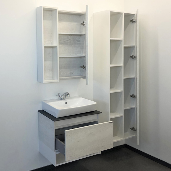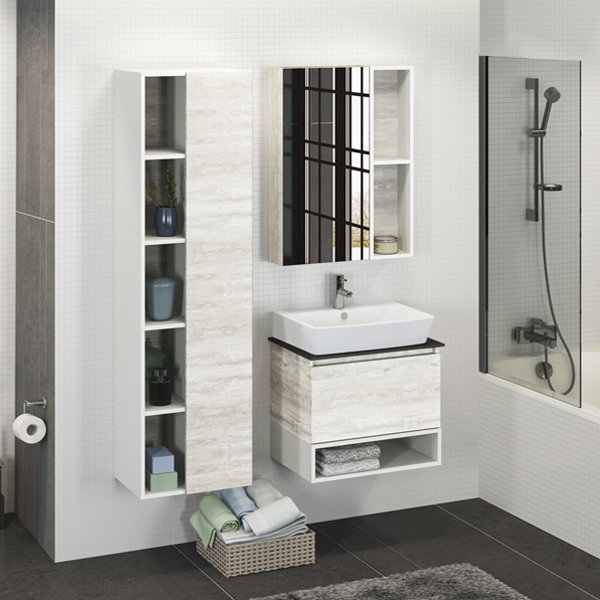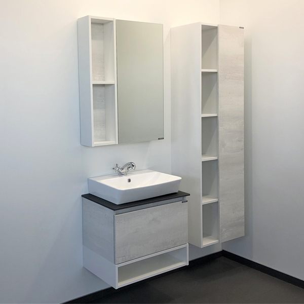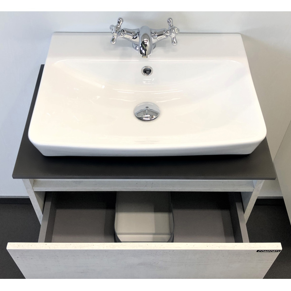 Тумба-умывальник Прага 60 Варианты цвета корпуса и фасада: Дуб белый, Белый глянец Материал корпуса: влагостойкая ЛДСП Габариты (ШхВхГ): 600*600*400 мм Комплектация: раковина Comforty 9055RA-50 Компактная подвесная тумба с большим выкатным ящиком и нижним пространством открытого хранения. Направляющие ящика оснащены системой плавного закрывания. Тумба укомплектована столешницей и плинтусом из керамогранита и накладной раковиной с прямоугольной чашей.