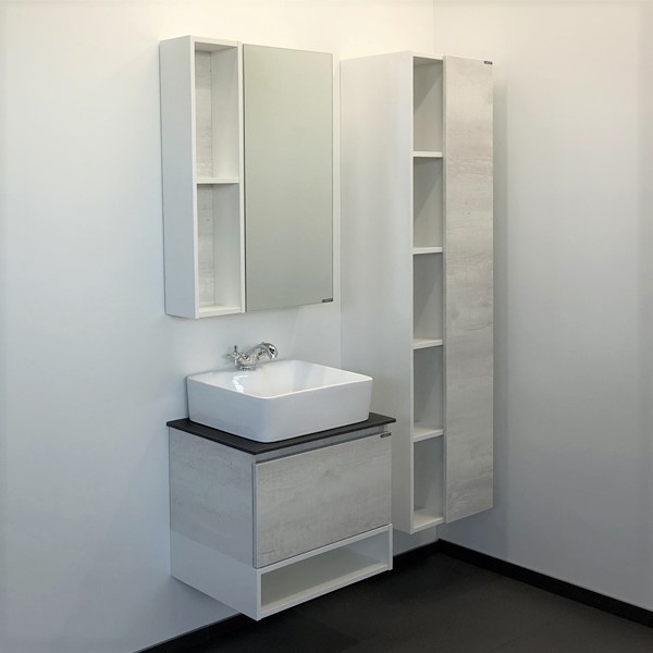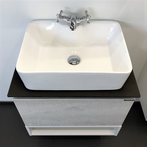 Тумба-умывальник Прага 60 Варианты цвета корпуса и фасада: Дуб белый, Белый глянец Материал корпуса: влагостойкая ЛДСП Габариты (ШхВхГ): 600*600*400 мм Комплектация: Comforty PZ-6068 Компактная подвесная тумба с большим выкатным ящиком и нижним пространством открытого хранения. Направляющие ящика оснащены системой плавного закрывания. Тумба укомплектована столешницей и плинтусом из керамогранита и накладной раковиной с прямоугольной чашей.