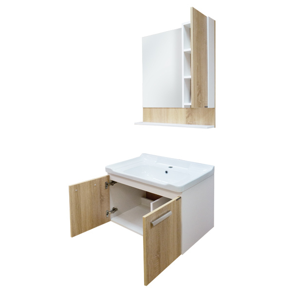 Тумба-умывальник Рига 70 Варианты цвета корпуса: Белый Материал корпуса: влагостойкое ЛДСП Цвет фасада: Дуб Сонома Материал фасада: влагостойкое ЛДСП Габариты (ШхВхГ): 720*550*470 мм Комплектация: раковина Comforty 9335-70 Подвесная тумба-умывальник с двумя распашными створками оснащенными системой плавного закрывания. За створками вертикальная перегородка по центру и горизонтальная полка справа.