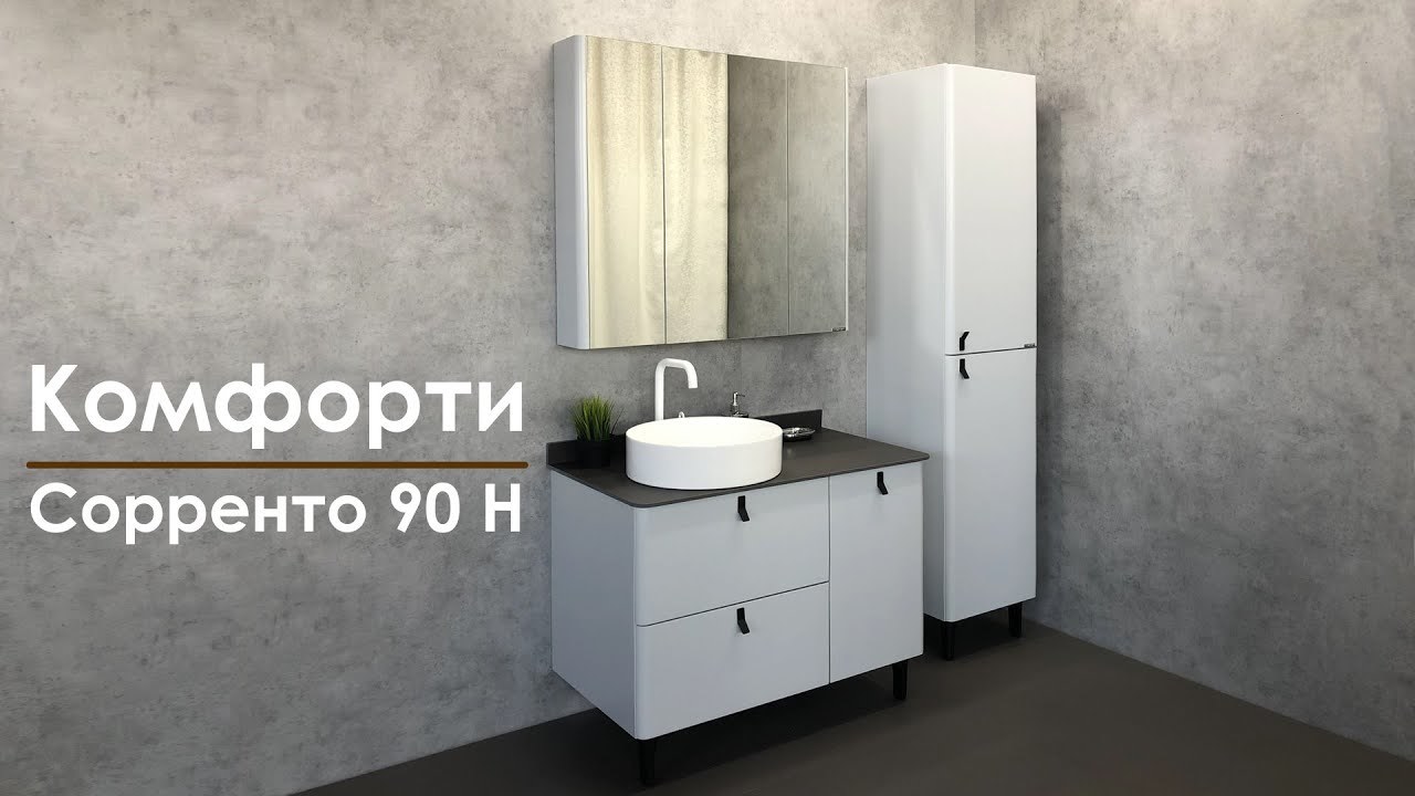 Тумба-умывальник Сорренто 90Н Варианты цвета: Светло-серый Материал корпуса и фасада: МДФ Габариты (ШхВхГ): 905*875*520 мм Комплектация: керамическая раковина Comforty 9110 (санфарфор) Напольная тумба-умывальник с тремя выдвижными ящиками. Направляющие ящиков оснащены механизмами плавного закрывания. Внутри правого вертикального ящика тканевая корзина для белья. Фасады и корпус тумбы из МДФ окрашены светло-серой эмалью. Тумба укомплектована черной столешницей и пристенным плинтусом из керамогранита, а также круглой керамической раковиной чашей. Тумба подготовлена для подключения водоснабжения снизу. Черные ножки тумбы из массива дерева. Оригинальные ручки-скобы из металла.