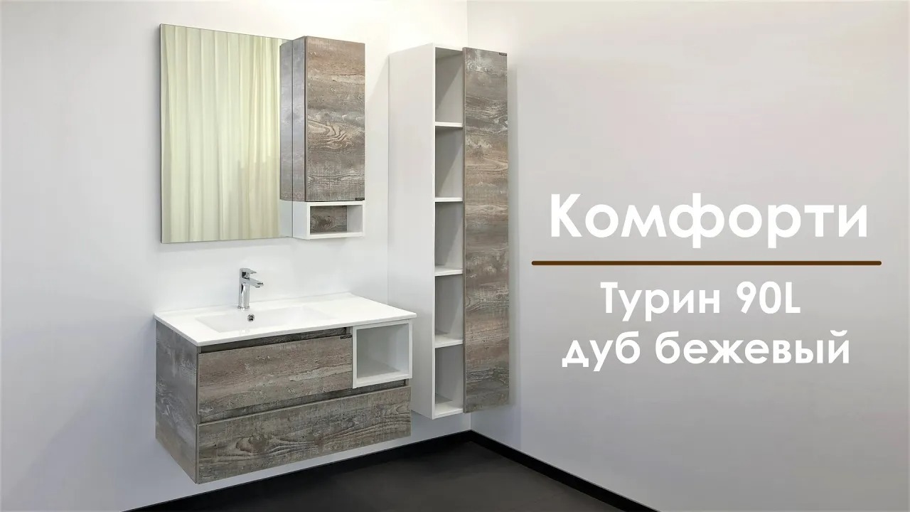 Тумба-умывальник Турин 90L Варианты цвета корпуса: Дуб бежевый/Белый матовый Материал корпуса: влагостойкое ЛДСП Цвет фасада: Дуб бежевый Материал фасада: влагостойкое ЛДСП Габариты (ШхВхГ): 905*495*470 мм Комплектация: накладная раковина Comforty 9090EL. Подвесная тумба с двумя ящиками оборудованными системой плавного закрывания и пространством для открытого хранения. В комплекте асимметричная раковина с широким правым "крылом".