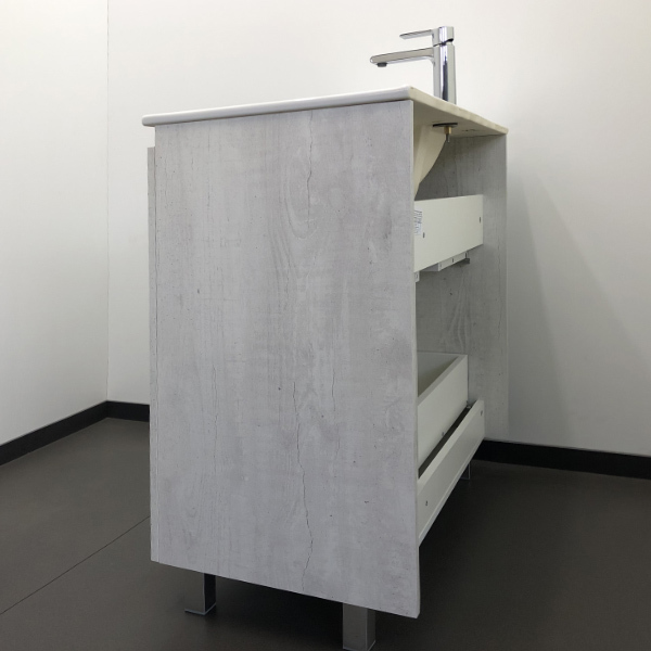 Тумба-умывальник Верона 90 Варианты цвета: Дуб белый Материал корпуса и фасада: влагостойкое ЛДСП Габариты (ШхВхГ): 905*870*470 мм Комплектация: раковина Comforty 90E (санфаянс) Напольная тумба-умывальник с двумя выдвижными ящиками и одной створкой. Ящики оснащены петлями с системой плавного закрывания. Створка откидная с корзиной для белья.
