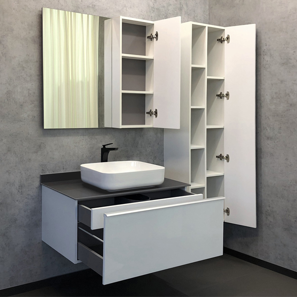 Тумба-умывальник Милан 90 Варианты цвета корпуса: Белый глянец Материал корпуса: влагостойкое ЛДСП Цвет фасада: Белый глянец Материал фасада: МДФ Габариты (ШхВхГ): 900*550*520 мм Комплектация: столешница из керамогранита, накладная раковина Comforty T-Y9378 (санфаянс) Подвесная тумба-умывальник с одним большим выкатным ящиком, оснащенным системой плавного закрывания и внутренним ящиком оснащенным системой push-to-open (открытие при нажатии). Фасады покрыты белой глянцевой эмалью