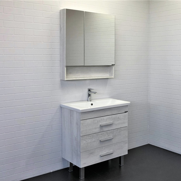 Тумба-умывальник Никосия 70Н Варианты цвета корпуса и фасадов: Дуб белый Материал корпуса и фасадов: влагостойкое ЛДСП Габариты (ШхВхГ): 700*860*450 мм Комплектация: керамическая раковина Como 70 (санитарный фарфор) Напольная тумба с тремя выдвижными ящиками, оснащенными системой плавного закрывания. Оригинальные эргономичные металлические ручки.