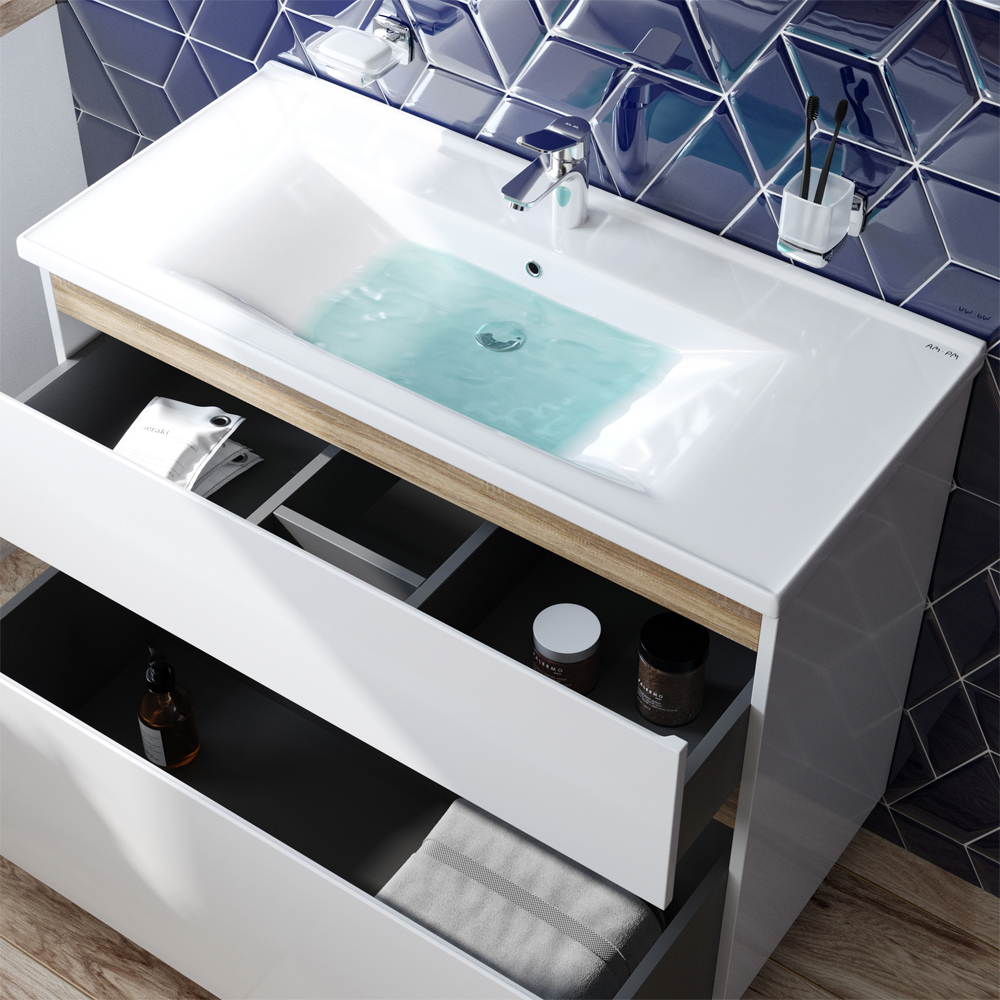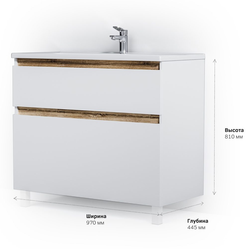 Впервые на рынке – дизайнерская коллекция сантехники которую может позволит себе каждый. Самое эстетичное сочетание цветов и фактур от дизайн-бюро Danelon Meroni (Великобритания & Италия): белые глянцевые фасады дополнены отделкой под светлое дерево. Функциональный органайзер в первом ящике позволит хранить необходимые косметические средства под рукой и в полном порядке. Внутреннее покрытие каждого ящика выполнено в современном цвете Anthracite и имеет противоскользящее покрытие. Встроенная керамическая раковина белоснежного цвета оснащена специальным бортиком для защиты от пролива воды за мебель. Экологически чистые и удивительно долговечные полиакриловые эмали – cпециальная технология покраски в 7 слоев превосходит технологию нанесения автоэмали у ведущих немецких марок и обеспечивает насыщенный цвет в течение всего срока службы (от 10 лет).