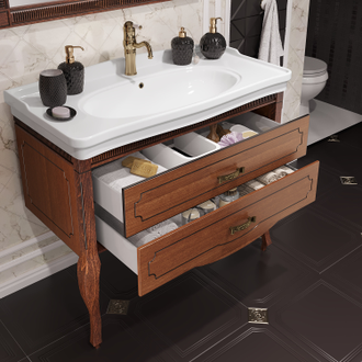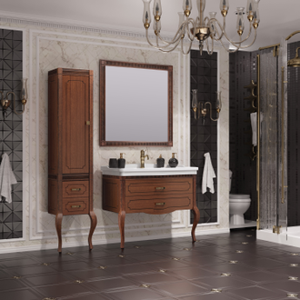 Коллекция Фреско выполнена в стиле Модерн и поражает своей легкостью и совершенством. Два выдвижных ящика с механизмами «плавного закрывания» разместились на изящных гнутых ножках ручной работы и натурального массива бука, фасады мебели из коллекции для ванной комнаты Фреско в цвете Светлый Орех обрамлены темной патиной. Мебель из коллекции Фреско предлагается в двух размерах 80 см и 100 см. Очаровательный и легкий пенал на гнутых ножках дополняет коллекцию мебели для ванной комнаты Фреско.