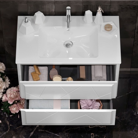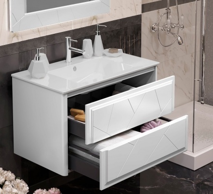 Мебель для ванной Opadiris «Луиджи 90» впечатляет эргономичностью и элегантным дизайном. Подвесная мебель в универсальном цветовом решении – отличный выбор для типовой ванной комнаты, так как не загромождает пространство и обеспечивает удобную уборку пола. По периметру зеркала имеется светодиодная подсветка с сенсорным управлением. Тонкая керамическая столешница с глубокой чашей удобна в использовании. Система хранения представлена двумя выдвижными ящиками, верхний из которых организован под раздельное хранение мелких принадлежностей. Современные системы push-to-open обеспечивают открывание ящиков легким нажатием на фасад, немецкие направляющие Hettich поддерживают плавный ход закрывания. Мебель производится из влагостойких и долговечных материалов: корпус и фасад – из прочной МДФ, окрашенной по технологии УФ-отверждения, зеркало – на основе серебряной амальгамы.