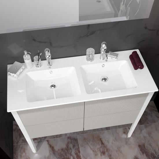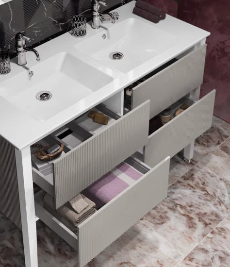 Коллекция РУБИННО 120 исполнена по всем современным требованиям стиля для мебели в ванную комнату 2021 года. Плиссированные фасады с технологией открывания push-to-open покрыты влагостойкой эмалью серого цвета. Мебель укомплектована ультратонкой керамической раковиной на две чаши, которая даёт возможность встречать каждое утро вдвоем. Зеркальное полотно с широким фацетом подчеркивает строгие формы коллекции, а светодиодный светильник над зеркалом освещает рабочее пространство.