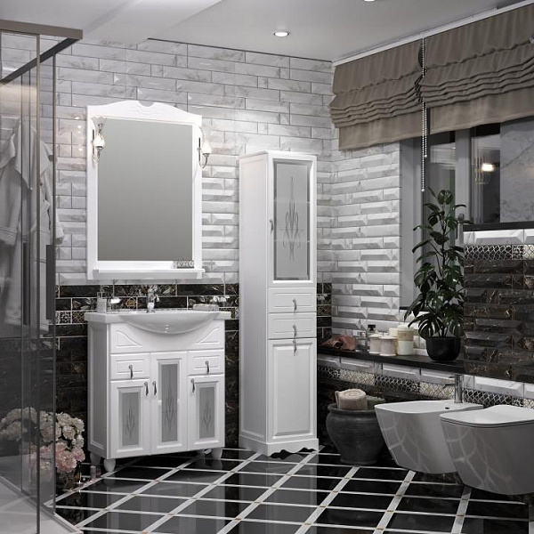 Коллекция мебели для ванной комнаты Тибет представляет собой великолепное сочетание традиционной классики и современного взгляда на ванную комнату.Коллекция Тибет отличается своим многообразием в решениях с фасадными частями. Для отделок Нагал и Белая и комплектов 55 см, 75 см и 85 см фасадные части выполнены в виде декоративной решетки. Комплект мебели Тибет 55 см в отделке Слоновая кость также предлагаются с фасадом в виде декоративной решетки. Комплекты мебели для ванной комнаты коллекции Тибет 75 см и 85 см в цвете Слоновая кость предлагаются с фасадами украшенными дверцами с художественным стеклом.Дополнительно в коллекцию входит напольный пенал, также выполненный в двух версиях: с матовым стеклом (верхняя дверца пенала) для отделок Нагал и Белая, нижний фасад предлагается с декоративной решеткой и бельевой корзиной и с художественным стеклом (верхняя дверца пенала) для отделки Слоновая кость, нижняя дверца пенала также с бельевой корзиной.