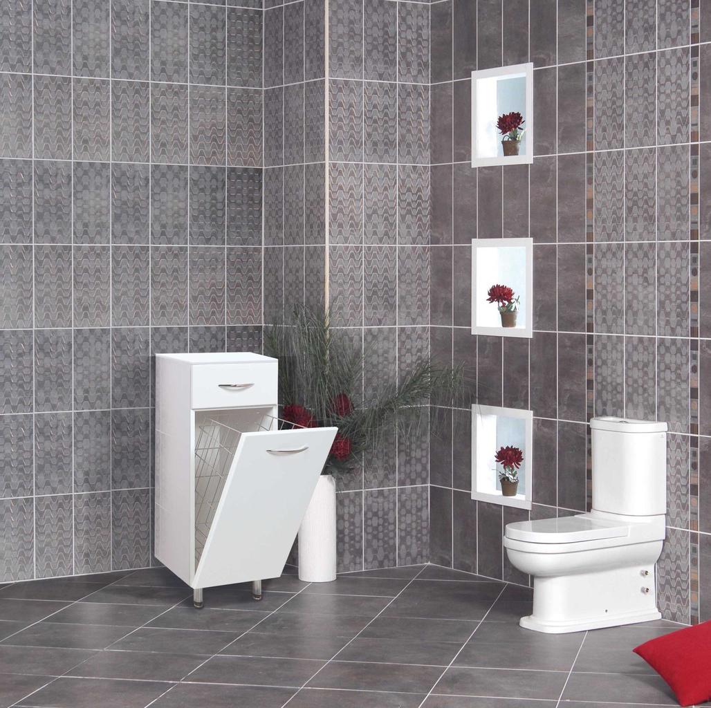 Оптимальная высота пенала позволяет использовать его поверхность как дополнительную столешницу, небольшой удобный ящик с направляющими полного выдвижения подойдет для хранения мелких аксессуаров, а за дверцей скрывается отделение с корзиной для белья.