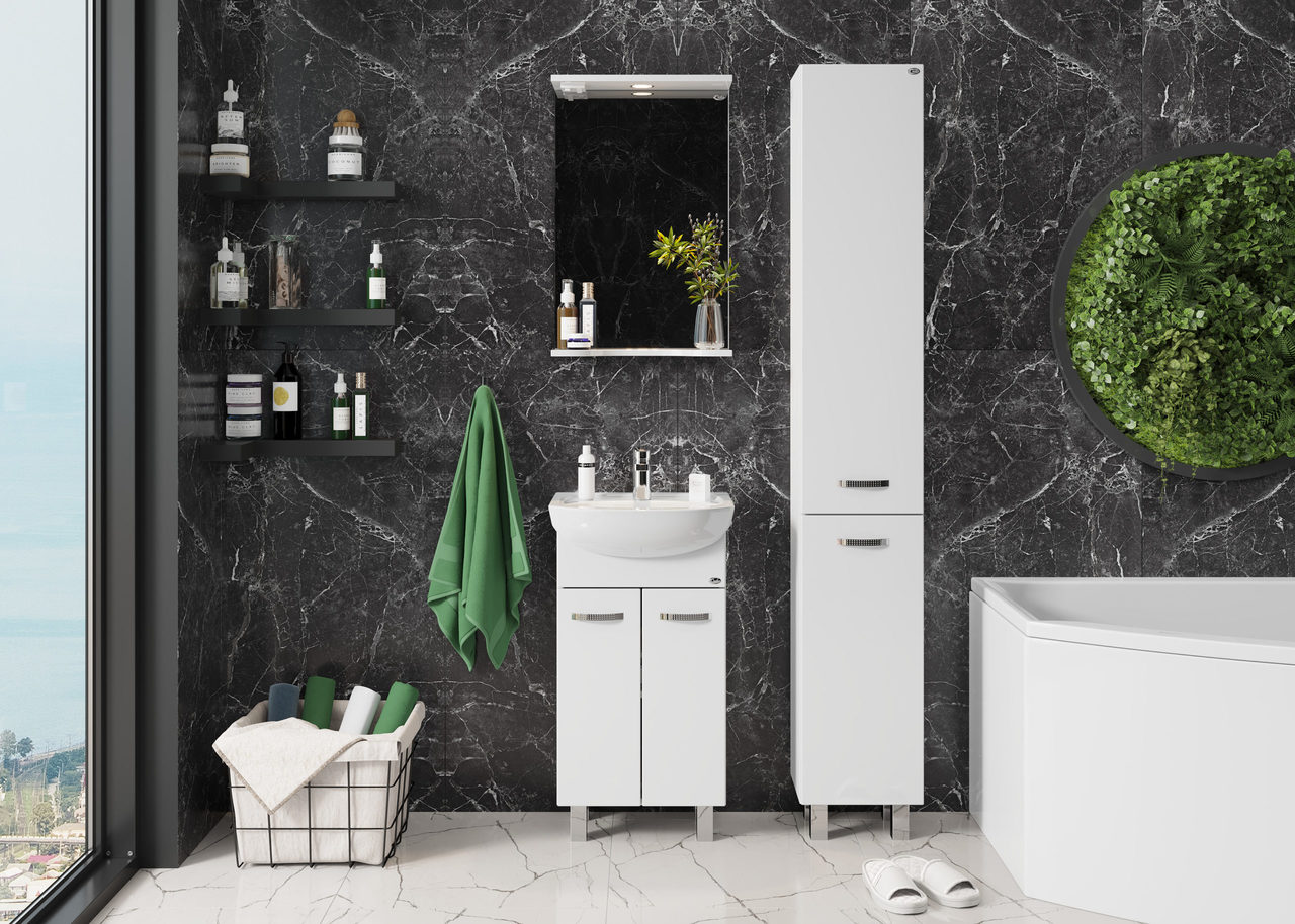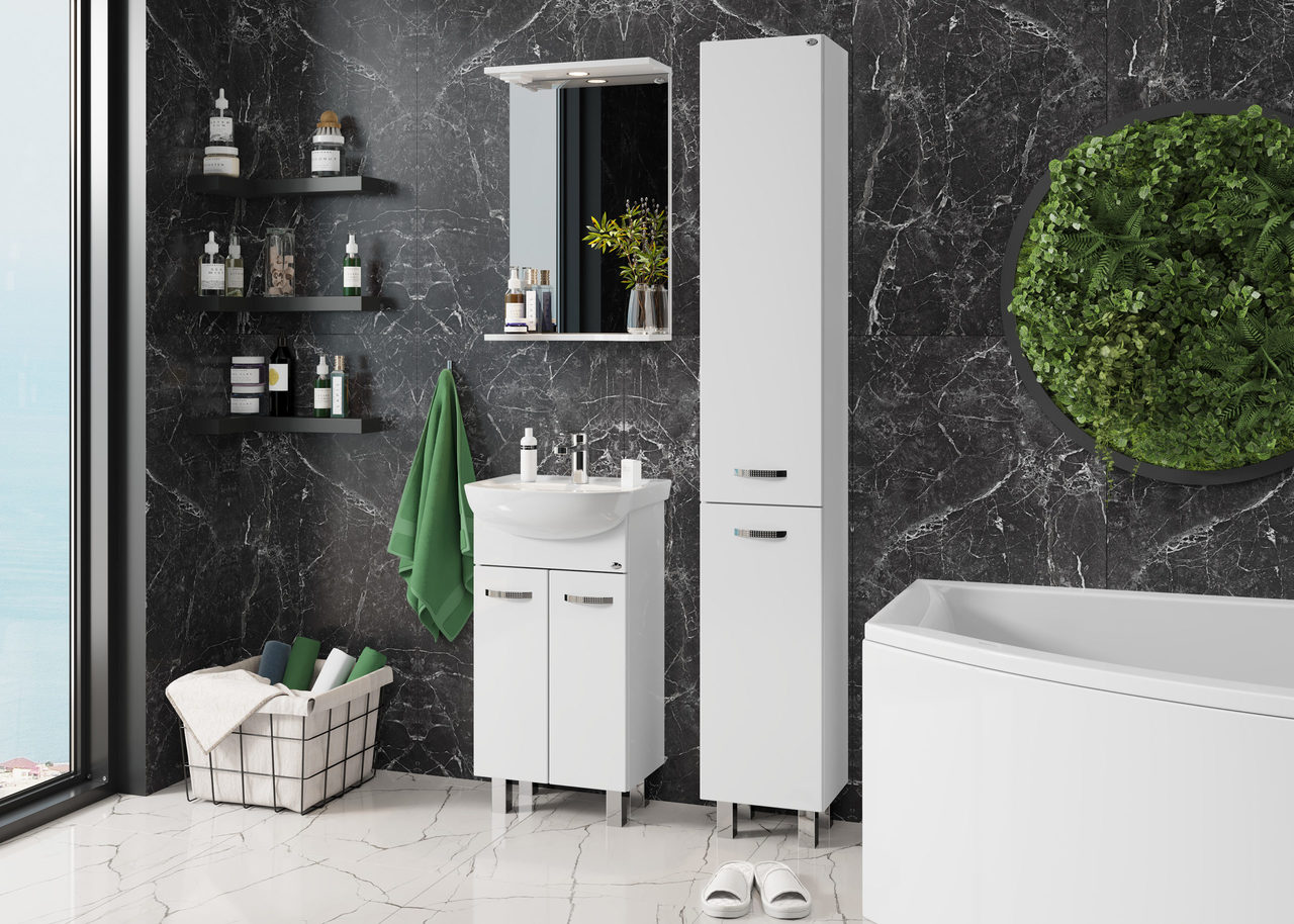 Корпус пенала выполнен из ЛДСП, фасад - из МДФ в пленке, специально предназначенных для использования в условиях высокой влажности.