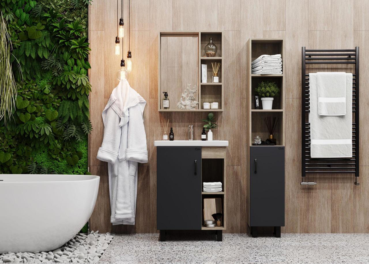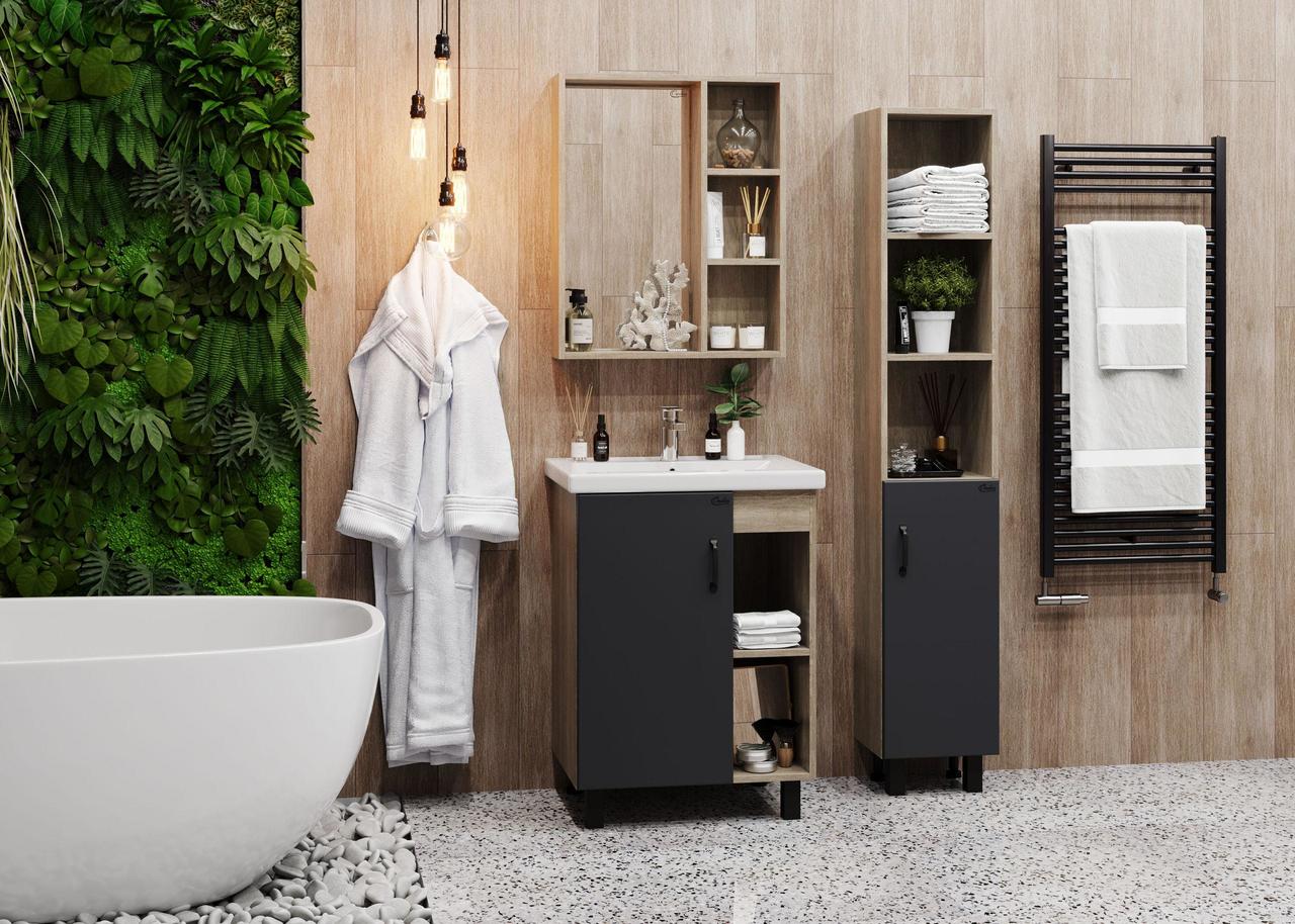 В пенале Onika ТИМБЕР 60.01 удачно сочетаются контрастные цвета и фактуры: серый матовый фасад с покрытием SoftTouch, корпус цвета дуба с роскошной текстурой, черная матовая металлическая фурнитура.