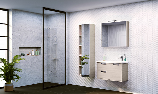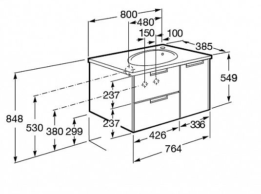 Тумба для раковины Etna в современном стиле от испанского бренда Roca, выполненная из влагостойкой высококачественной ЛДСП с ящиками и распашной дверцей с доводчиками.