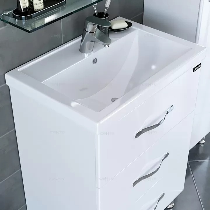 В верхних ящиках организован доступ к подключению коммуникаций.Тумба укомплектована красивой современной прямоугольной раковиной из санфаянса.