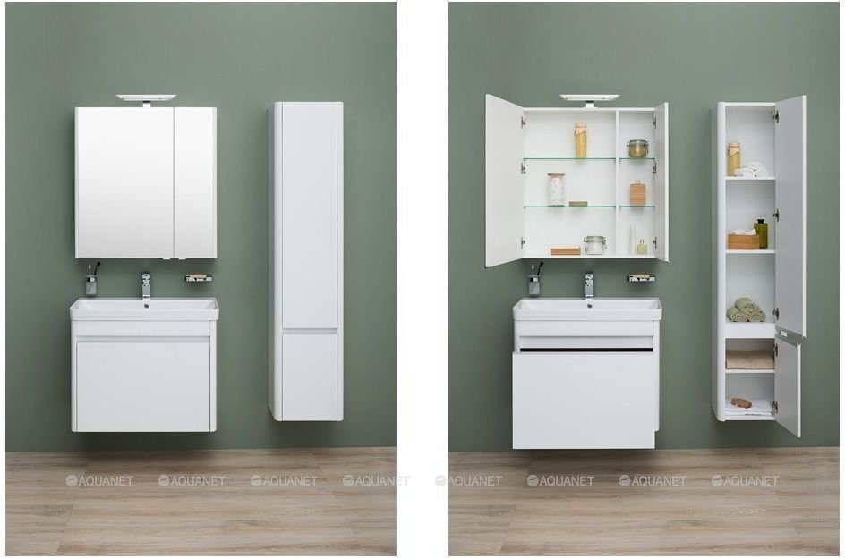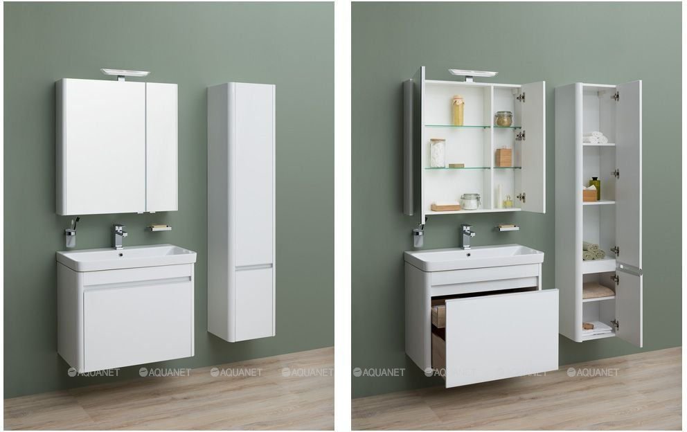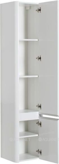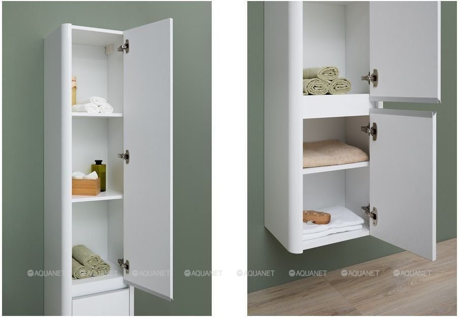 Шкаф-пенал для ванной Aquanet Вилора 40 белого цвета с белоснежными глянцевыми поверхностями фасадов из МДФ, скругленными углами и удобной зоной хранения придется по вкусу ценителям максимальной функциональности при минимуме лишних деталей.