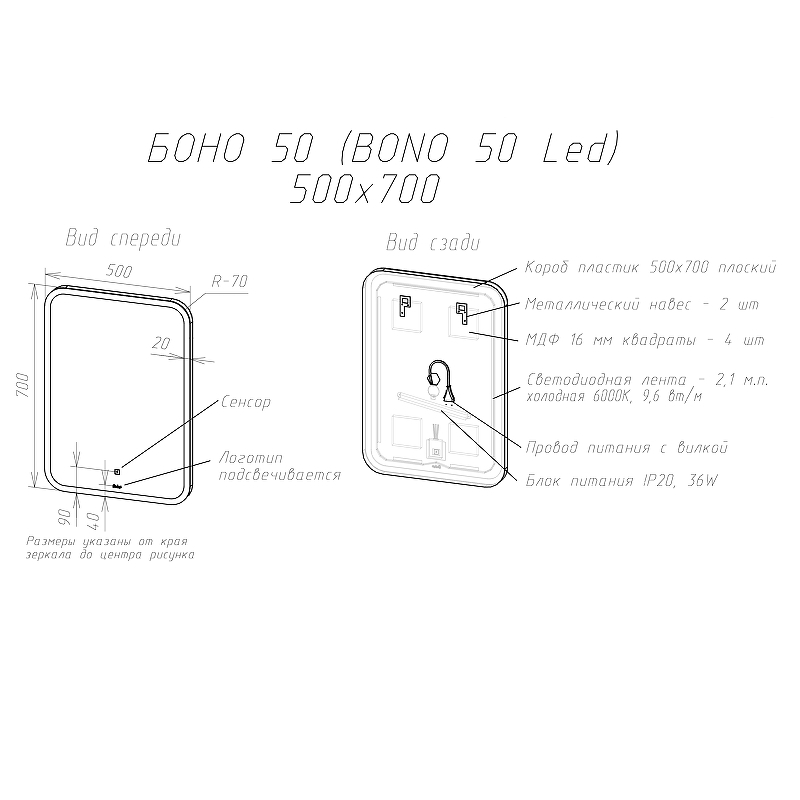 Зеркало нестенное BONO 50, 500х700 с LED подсветкой и сенсорным выключателем.