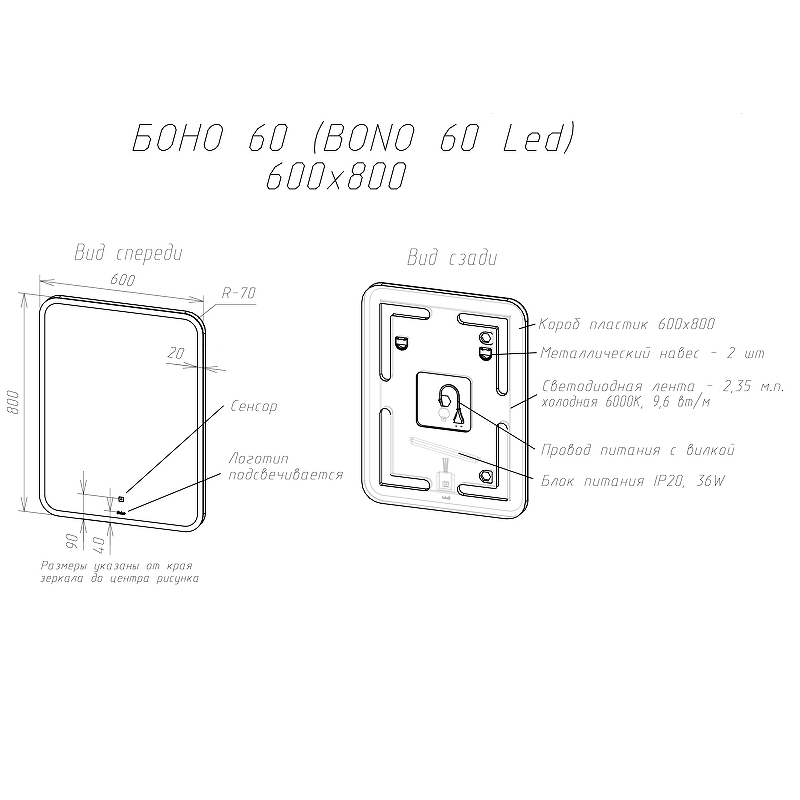 Зеркало нестенное BONO 60, 600х800 с LED подсветкой и сенсорным выключателем.