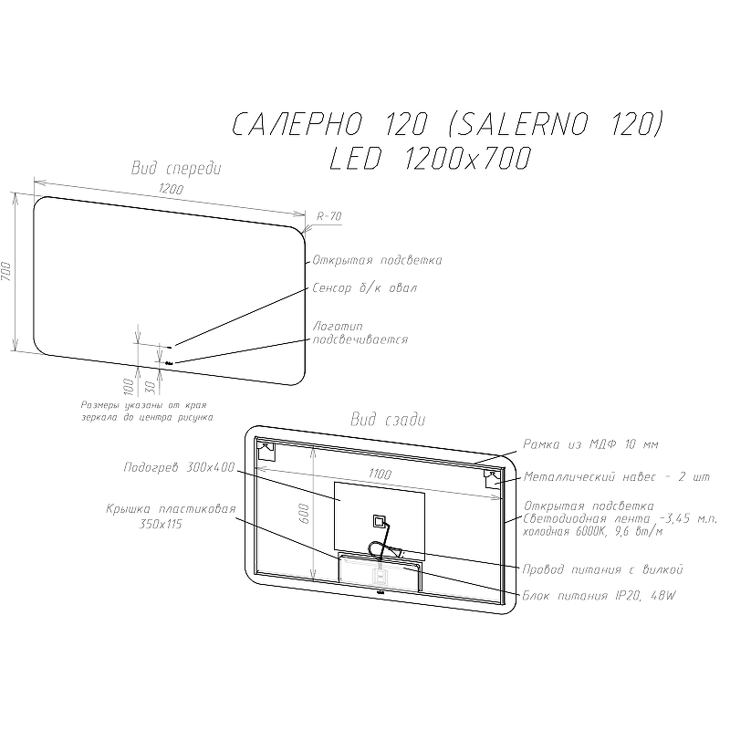 Зеркало настенное SALERNO 120, 1200x700 с бесконтактным включением.