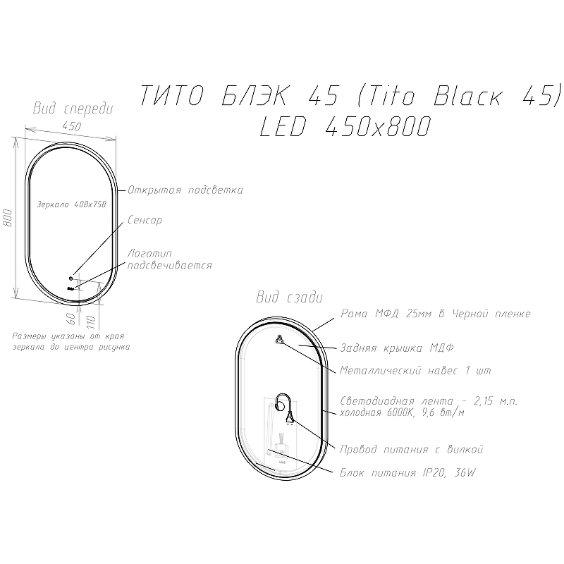 Зеркало настенное TITO 45, 450х800 c подсветкой .