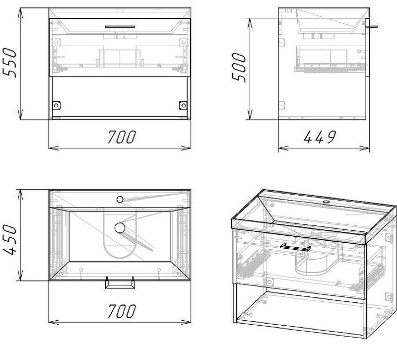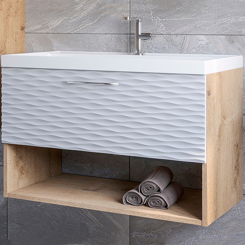 • Функциональность модели "Ундина" обеспечивается разнообразными закрытыми и открытыми полочками, глубокой раковиной, компактной подвесной конструкцией и наличием доводчиков.