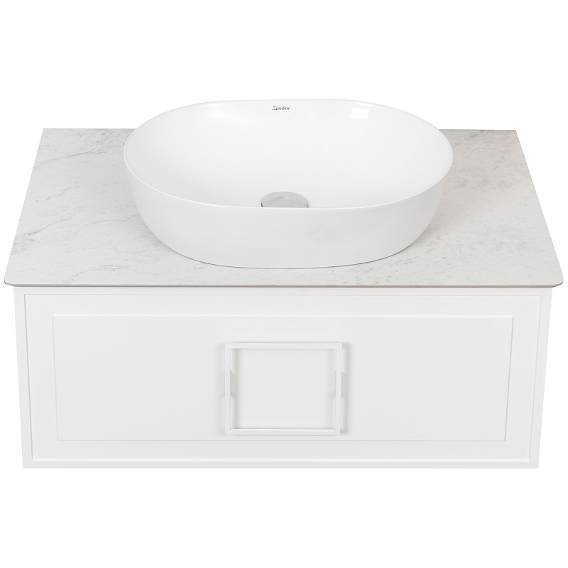 Белая мраморная столешница выполнена из неполированного керамогранита.