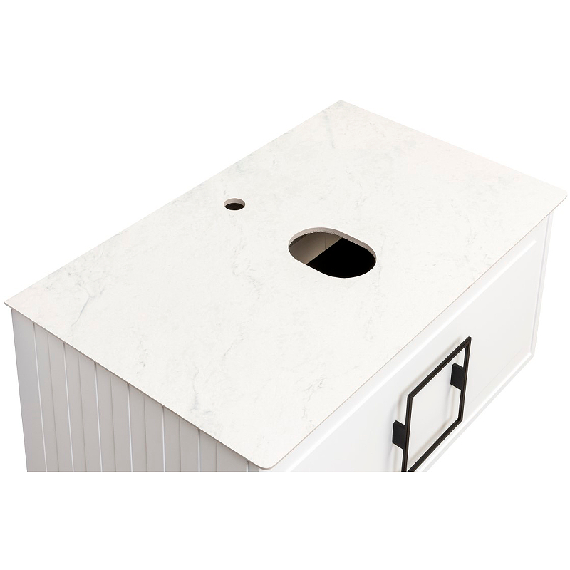 Белая мраморная столешница выполнена из неполированного керамогранита.