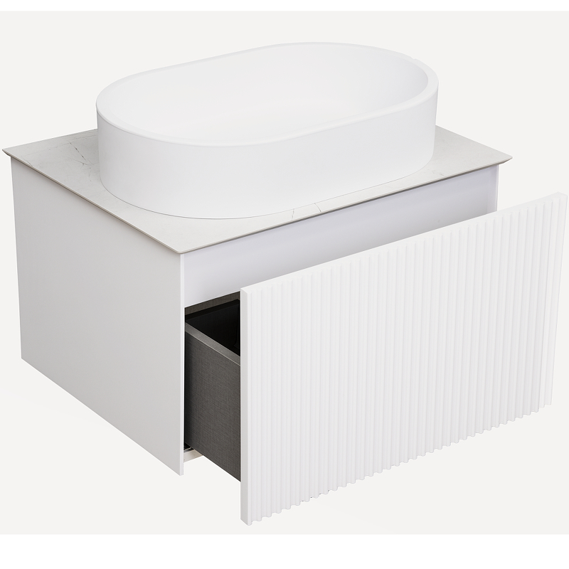 Белая мраморная столешница выполнена из неполированного керамогранита.