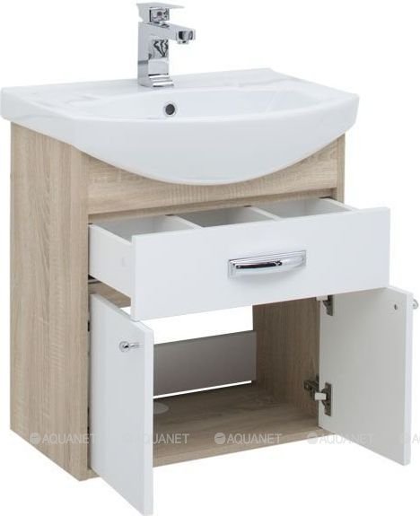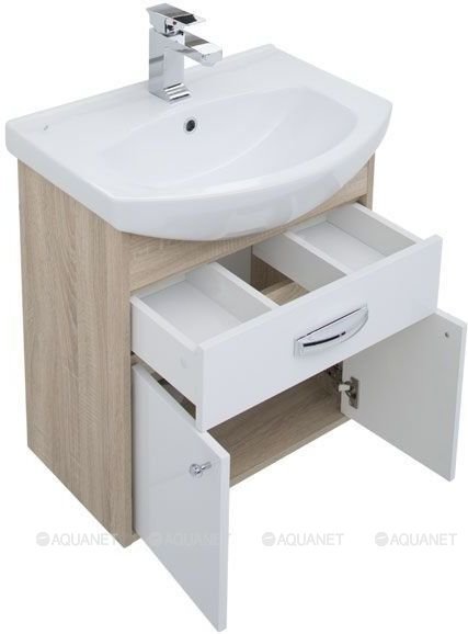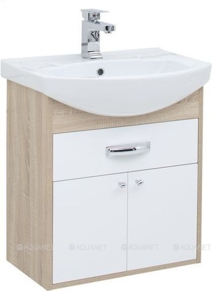 Тумба Aquanet Грейс 60, цвет - дуб сонома/белый, (1 ящик, 2 дверцы) выполнена в цветовом сочетании белого глянца с древесной фактурой «дуб сонома».