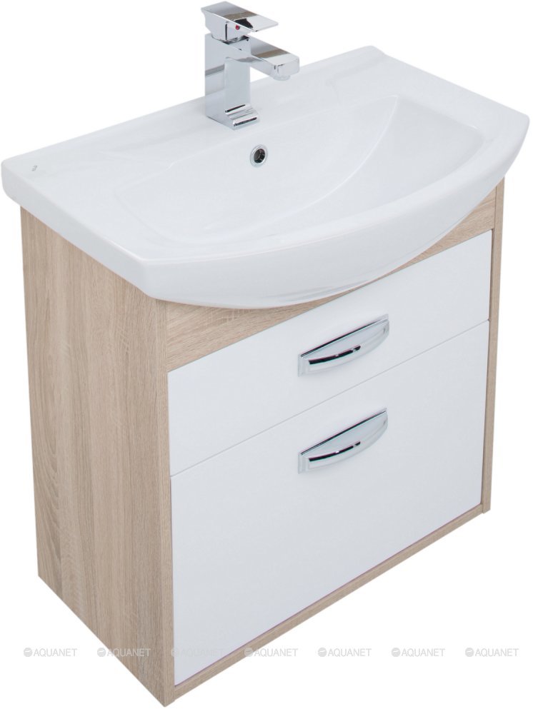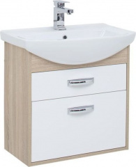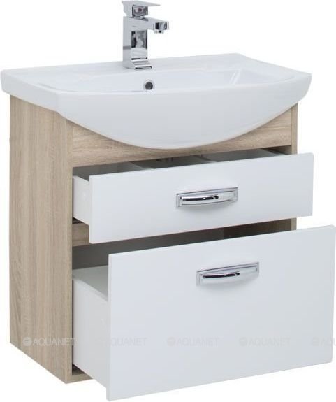 Тумба Aquanet Грейс 65, цвет - дуб сонома/белый, (2 ящика) выполнена в цветовом сочетании белого глянца с древесной фактурой «дуб сонома».
